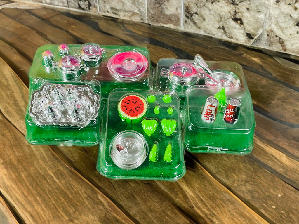 A variety of plastic food items like watermelon, green vegetables, and drinks (e.g., cola, 7Up).
